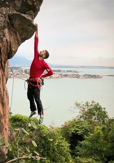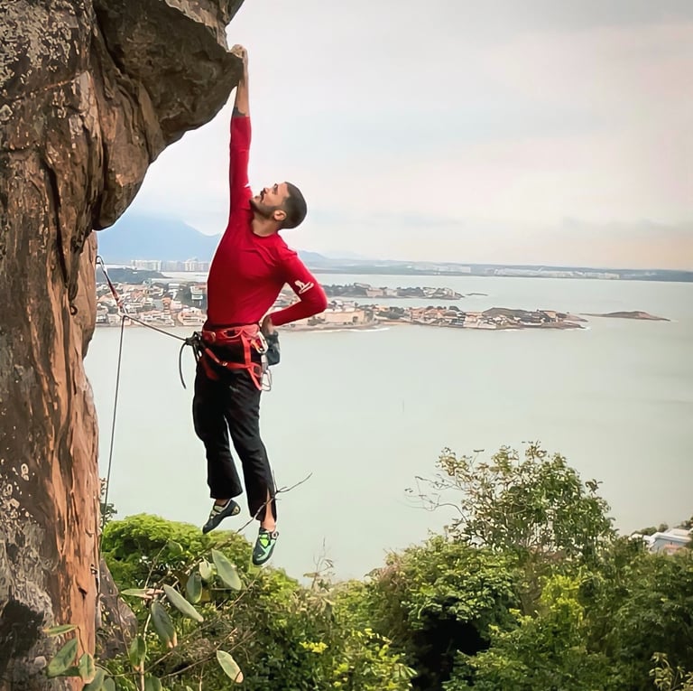 Antes de completar 1 ano já escalei em via esportiva um 7B, guiei minha primeira TRAD a via "plano de manejo" com meu Pai Doug e nos Boulders estou atrasado.